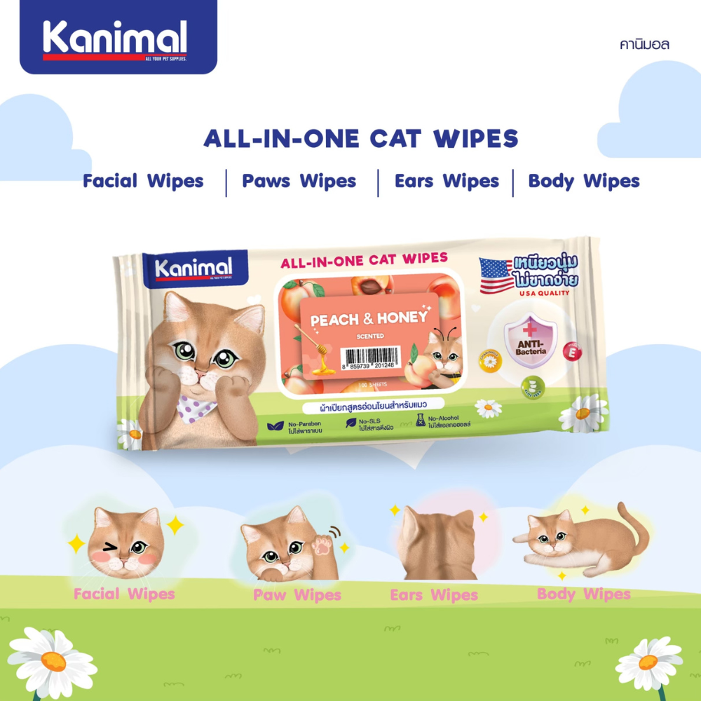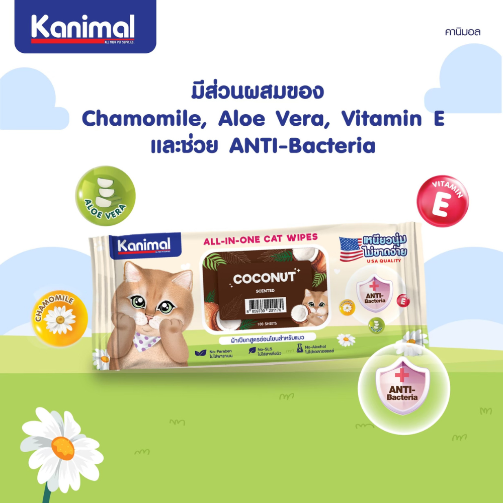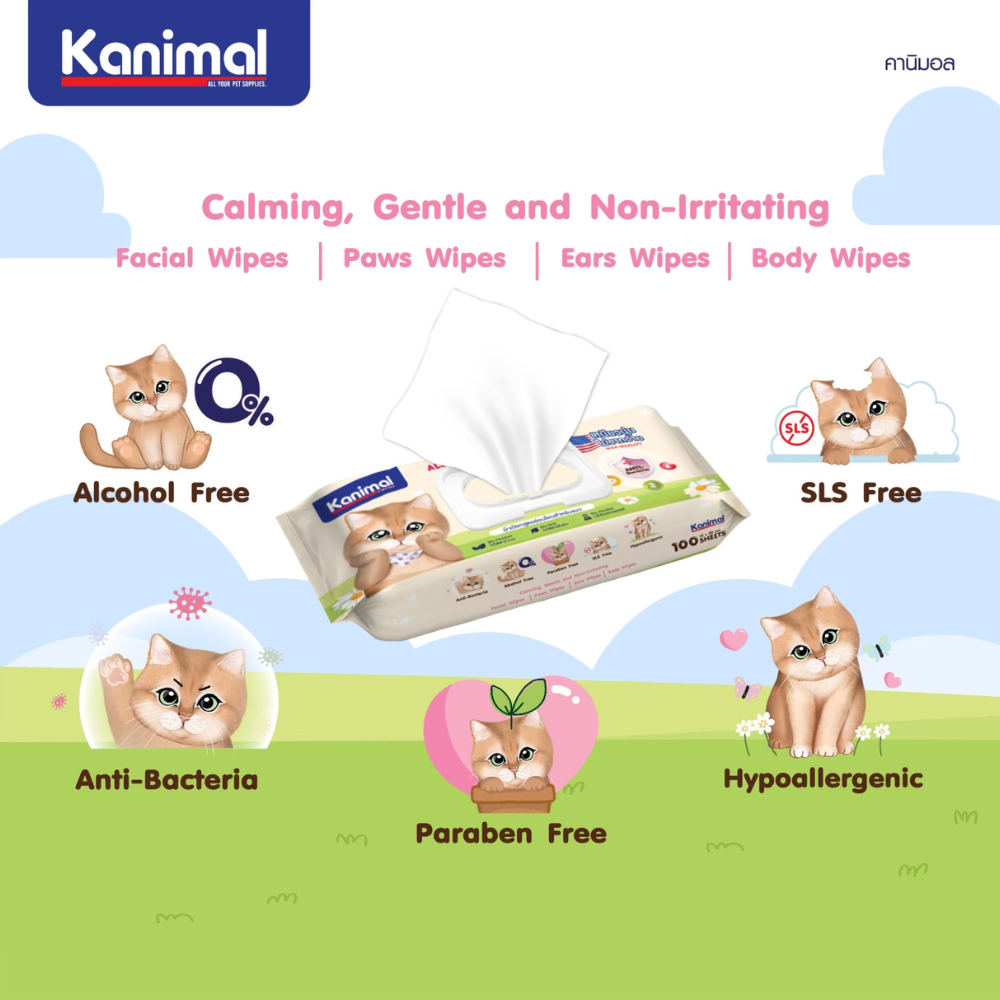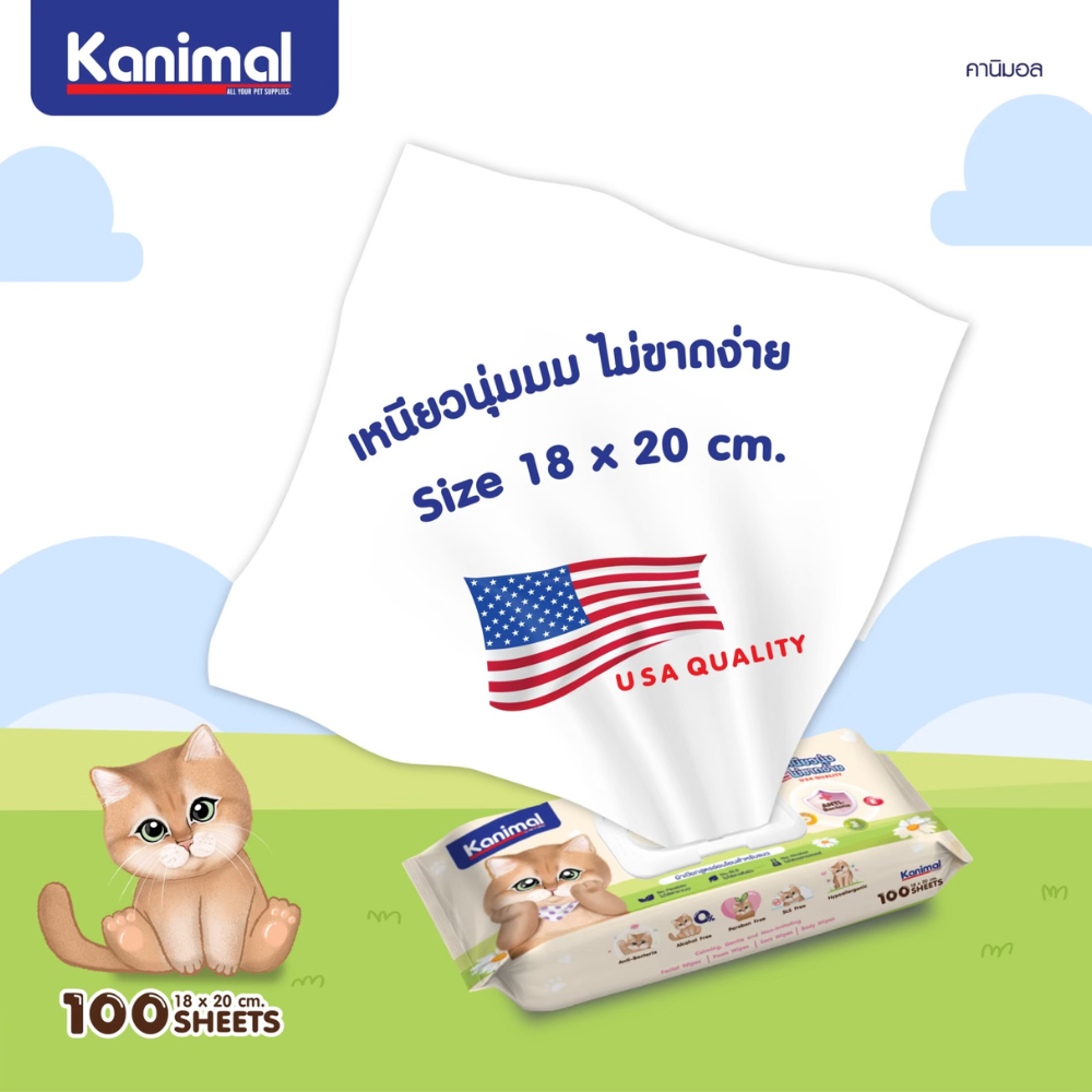 [ 1แพ็ค 100แผ่น ] Kanimal Cat Wipes คานิมอล ทิชชู่เปียก ผ้าเปียกเช็ดทำความสะอาด สำหรับแมว สูตร อ่อนโยน กลิ่นหอมละมุน