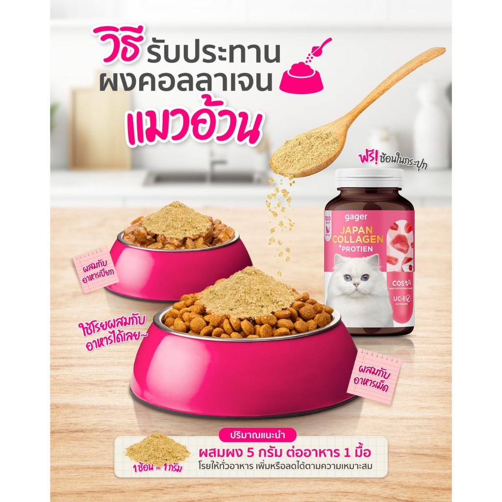 อาหารเสริมแมวอ้วน ผงคอลลาเจนแมวอ้วน เป็นผงโปรตีนสำหรับแมว มีส่วนประกอบที่สำคัญอย่างคอลลาเจนที่ใช้นำเข้าจากญี่ปุ่น