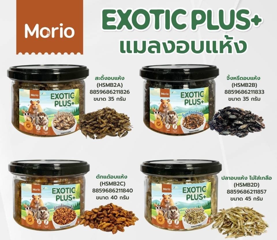 | สูตร | จิ้งหรีดอบแห้ง 35g, ดักแด้อบแห้ง 40g, ปลาอบแห้ง 45g, สะดิ้งอบแห้ง 35g |
